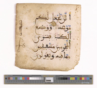| الوصف | Arabic manuscript of vellum, each folio with 4ll. of sepia maghribi, one sura heading in gold issuing marginal medallion, diacritics in yellow, green, blue and red, various marginal notes and sketches, gold and polychrome verse markers., Morocco,circa 13th Century, اعتمدت هذه التسجيلة المؤقتة على الفهرسة الأولية السابقة للمجموعة., Main Heritage Shelves General, HC.MS.03097, Manuscripts, Item-ID: i25002442, BIB-ID: 2682461 |