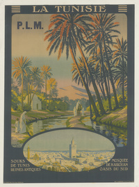 Vintage travel poster issued for the French railway company "Chemins de fer de Paris-Lyon-Méditerranée" (Paris, Lyons, Mediterranean Railway Company, usually known simply as the P.L.M.) advertising Tunisia as a tourist destination. The poster depicts an oasis and a view of Tunis., Title from item, date devised by Library staff. The poster is signed and inscribed "Atelier Constant Duval 19, Villa Chaptal. Levallois (Seine)" and "Imp. F. Champenois 66, Bould. St. Michel. Paris". Lower image is titled "Vue de Tunis" (View of Tunis). On the upper left part of the image "P.L.M.", the acronym of the "Chemins de fer de Paris-Lyon-Méditerranée" (Paris, Lyons, Mediterranean Railway Company)., Main Heritage Compact General, HC.GM.P.2019.0175, 2-D Graphic, Item-ID: i26227009, BIB-ID: 2802884 |