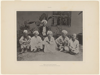 Full-length seated portrait of six Muslim pilgrims from Kerinci, in the island of Sumatra - one of them is described as a sheikh of the same place. They squat or sit face forward on the ground, looking towards the camera. The photograph was probably taken in Jeddah between 1884 and 1885. The men are photographed in a courtyard-like space with plants – some in wide wooden pots – foliage and a window, fronted by bars, visible in the background. The negative had handwork applied., Title and date from item. Plate no. 34 in Bilder-Atlas zu Mekka (Haag : Martinus Nijhoff, 1888-1889). The plate is numbered (XXXIV) and titled in German under the image., Main Heritage Compact General, HC.HP.02074-0034, 2-D Graphic, Item-ID: i26519057, BIB-ID: 2831700 |