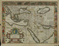 The middle meridian is 70, the rest are inclined unto this by reason of the 20 45 parallels. [cart. with arms of Turkey]. Are to be sold by Tho. Basset in Fleet Street & Ric: Chiswell in St. Pauls Churchyard [cart. low l. h.] A copy of Hondius map of 1606 covering 40°-100°E. 10°-50°N. Ten pictures showing dress and 8 town plans.English text on verso. Scale: The Germa miles, 90. The Italian miles, 360. Size: 39 x 51 cm. [plate]. 34.50 x 4.40 cm. [map] Published in 1626 and reprinted in 1631 and 1662., The top features 8 bird's eye views of the cities Famagusta, Damascus, Cairo, Jerusalem, Constantinople, Rhodes, Alexandria and Ormus, and side borders each of 5 costumed figures from the Ottoman Empire, Relief shown pictorially, Main Heritage Compact General, HC.MAP.01001, Print Map, Item-ID: i11402660, BIB-ID: 1172609, In: [In: "A Prospect of the most famous parts of the World." fol. 35]. |