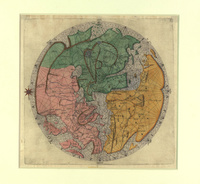 Relief shown pictorially., Circular world map with Jersusalem at the center, based on a portolan chart by Pietro Vesconte which originally appeared in the Liber secretorum fidelium crucis super Terrae Sanctae recuperatione et conservatione, by Marino Sanudo., [World Sphere]. Map of the world placing Jerusalem, the centre and showing three continents namely; Europe, Asia and Africa. The map is roughly made and this is probably due to limited knowledge of the area. For example Africa is drawn like a shoe, there is much exageration at the south. Arabia is represented in rectangular shape, with Mecca as the centre of Arabian peninsula, two other towns are marked as Cede port (part of Jeddah) and St Catarina, this is placed not very far from Jeddah. There are lines from south, north, west and east making point of inter-section at Jerusalem. Size: 34 x 34.40 cm. Published in 1611. Coloured. Latin., From: Gesta Dei per Francos ... [Edited by Jacques Bongars]. Hanoviæ : typis Wechelianis, apud heredes I. Aubrii, 1611., Title supplied by cataloger., Main Heritage Display General, HC.MAP.00904, Print Map, Item-ID: i11402337, BIB-ID: 2768577 |