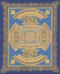 Arabic manuscript on paper, the central roundel with hadith in 7ll. o f black naskh above a small signature, further lines of calligraphy in... Show moreArabic manuscript on paper, the central roundel with hadith in 7ll. o f black naskh above a small signature, further lines of calligraphy in various styles arranged around, all the panels outlined in gold, gold and polychrome floral illumination, signed and dated in a panel beneath the central roundel, all of the calligraphic panels laid down on blue floral ground, between gold and polychrome minor margins and blue borders with gold illumination, framed and glazed. Amman, dated AH 1418/ 1997-98 AD اعتمدت هذه التسجيلة المؤقتة على الفهرسة الأولية السابقة للمجموعة. Main Heritage Vault HC.CALL.00276 Manuscripts Item-ID: i25232010 BIB-ID: 2706796 Show less
