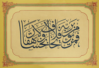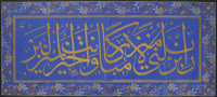 Arabic manuscript on blue paper, the composition with a single line of large gold thuluth, within gold rules, with gold floral illummated borders,... Show moreArabic manuscript on blue paper, the composition with a single line of large gold thuluth, within gold rules, with gold floral illummated borders, mounted, framed and glazed. Ottoman Turkey, dated AH 1292/ 1875-76 AD اعتمدت هذه التسجيلة المؤقتة على الفهرسة الأولية السابقة للمجموعة. Main Heritage Vault HC.CALL.00249 Manuscripts Item-ID: i25230979 BIB-ID: 2706745 Show less