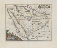 Relief shown pictorially., A 1662 Latin map of Arabia, a copy of an earlier map by Willem Janszoon Blaeu (1571-1638). Original copy is hand-colored double-page engraved map with large pictorial cartouche depecting figures, camels, and ships., One of the first maps to show internal features of the Arabian Peninsula. Mountains are depicted, oases denoted by trees, and points used to indicate pearl deposits in the Arabian Gulf. Dotted lines to show international borders. The Red Sea is denoted by three Latin names: Mare Rubrum, Mare Mecca, and Sinus Arabicus (Arabian Gulf) ; Sinus Persicus, and Mare Elcatif (al-Qatif Sea) for the Persian Gulf., Main Heritage Compact General, HC.MAP.00120, Print Map, Item-ID: i17065963, BIB-ID: 1525261 |