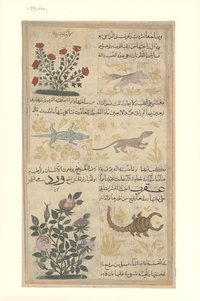 | Description | ILLUSTRATIONS FROM THE 'AJA'IB AL-MAKHLUQAT Probably IRAN Illustrations taken from Qazwini's The Wonders of Creation, Persian text on paper, six watercolours of plants and animals, the reverse with 26ll. of black naskh, within gold and polychrome rules Folio 11 ½ x 6 ¾in. (29.3 x 17.1cm.), Main Heritage Display General, HC.MS.2017.0043, Manuscripts, Item-ID: i24576311, BIB-ID: 2537468, اللغة العربية؛ خط النسخ |