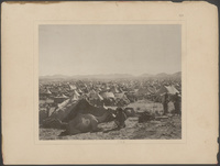 Photograph showing pilgrims with tents, camels, and livestock gathered at the rest station of Arafat during the Hajj. The photograph was taken the Meccan doctor and photographer al-Sayyid ʻAbd al-Ghaffar (active in 1880s) between 1886 and 1889., Title from caption list in original portfolio. Date from original item. Plate no. 16 in Bilder aus Mekka (Leiden : E. J. Brill, 1889). The plate is numbered (XVI). Erased Arabic description and signature “Photography by al-Sayyid ʻAbd al-Ghaffar, doctor in Mecca” in the upper and lower part of the print. The negative has handwork applied. Manuscript annotation in Arabic under the print "عَرَفَات", Main Heritage Compact General, HC.HP.11014-0010, 2-D Graphic, Item-ID: i26542493, BIB-ID: 2832259 |